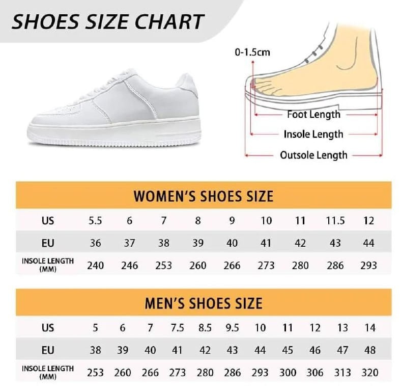 - Each pair of Sneaker Boots is custom printed, cut, and sewn just for you when you place your order – there may be small differences in the design on the seams and /or arms due to the custom nature of the production process!